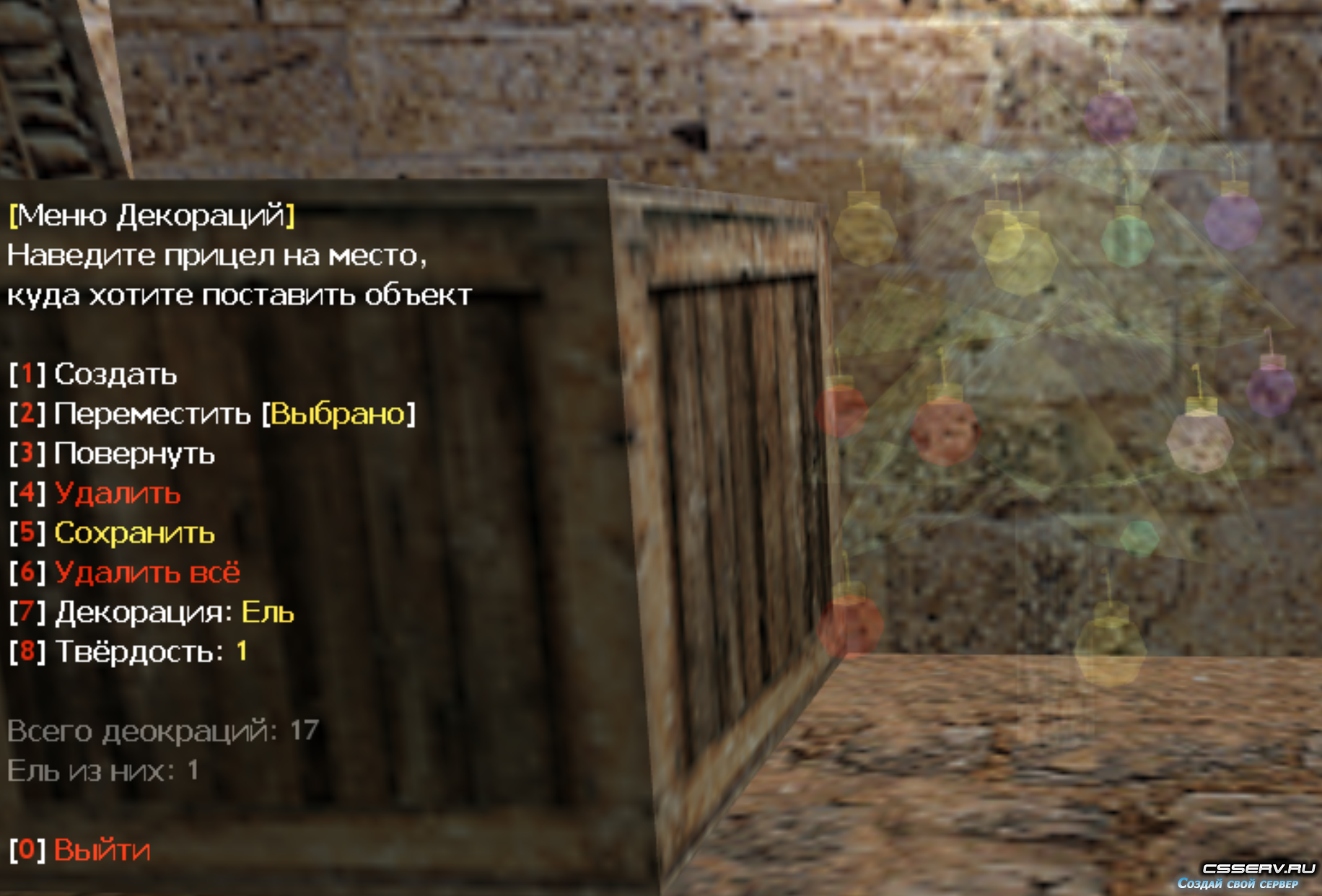 Удаление: Удаление декораций осуществляется 2 способами. 1 способ: Нажать на 6 пункт меню (Удалить всё). Будьте внимательнее, данный способ удаляет файл и не зависит от 5 пункта меню (Сохранить)!!! 2 способ: Наведите прицел на объект и нажмите 4 пункт меню (Удалить).